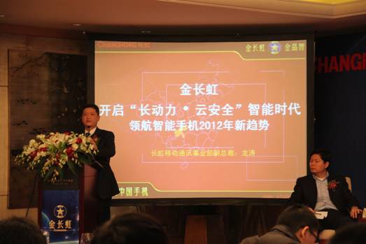 2012年1月5日,長虹集團(tuán)在北京萬達(dá)索菲特大飯店召開了以“2012智能手機(jī)新趨勢——長動力·云安全”為主題的新聞發(fā)布會。 當(dāng)天,長虹集團(tuán)規(guī)劃與技術(shù)戰(zhàn)略部部長陳曄、長虹集團(tuán)企業(yè)策劃部部長兼新聞發(fā)言人劉海中、長虹移動通訊事業(yè)部副總裁龍濤、長虹移動通訊事業(yè)部CTO/長動力研究院院長周建國、長虹移動通訊事業(yè)部重慶基地COO/云安全研究所所長何從華等長虹公司領(lǐng)導(dǎo)悉數(shù)高調(diào)出席發(fā)布會,共同見證“2012年智能手機(jī)新趨勢——長動力·云安全”發(fā)布會。同時,中國泰爾實(shí)驗(yàn)室總工程師史德年、聯(lián)發(fā)科技(MTK)中國區(qū)首席代表呂向正、奇虎360首席營銷官許四清等戰(zhàn)略合作伙伴的高層領(lǐng)導(dǎo)、專家人士也出席了此次發(fā)布會。 在此次發(fā)布會上長虹集團(tuán)高調(diào)發(fā)布其智能手機(jī)新戰(zhàn)略和全新的智能移動終端品牌“金長虹”;并同時發(fā)布三大系列新品:動力王系列、虹Phone系列、金長虹1958系列,擬在2012年掀起以“長動力·云安全”為主題的品牌運(yùn)動。