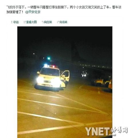 網友拍攝的警車接機畫面。 ????昨天,一位網友在網絡微博上發帖稱,昨天凌晨他在首都機場下飛機時,看見一輛閃爍著警燈的警車停在舷梯旁,接走了兩名20多歲的女性乘客,并有警察幫忙提行李。有說法稱,這是下了夜班的候機樓民警,用警車接他的女兒和同學。很多網友認為警車進機場跑道接人非常不妥,有“公車私用”之嫌。 ????警燈閃爍接走兩個姑娘 ????昨天,記者聯系到了網友“蘇堤的西湖”,他介紹說,他前天夜間乘坐吉祥航空HO1251次航班,從上海飛往北京,抵達北京首都機場時已經是23點40分左右。“蘇堤的西湖”說,飛機停穩后,機上的乘客們看到有一輛閃爍著警燈的警車,停在了飛機的舷梯下面。“蘇堤的西湖”說,當時他以為,這可能是一輛押運犯人之類的警車。不一會兒,兩個大約20多歲的姑娘有說有笑地上了警車,一位警察還從車上下來,幫著兩個姑娘拿著行李包。“蘇堤的西湖”說,兩個姑娘上車后,這輛警車就閃爍著警燈開走了。 ????部分乘客質疑“警車私用” ????“蘇堤的西湖”說,這輛警車的牌照是“京AXXXX警”。他拍攝的照片上,這輛警車停在機場跑道上,左前側的車門開著,車大燈和車頂的警燈都開著。據他回憶,當時天氣特別冷,又是深夜。他看到這兩個小姑娘直接就上了警車,他和其他乘客卻只能擠擺渡車,感覺“非常不舒服”。他對記者表示,當時擺渡車上估計有一百多人,以為這輛警車是在押運犯人,就都盯著。結果看到警車接走的是兩個小姑娘,大家都很氣憤。“蘇堤的西湖”氣憤地表示:“你接機也就罷了,卻閃著警燈,你到機場也就罷了,卻開到了飛機旁。” ????回復稱“將加強民警和警車管理” ????昨天下午6點左右,署名“北京邊防總站”的網友回復了“蘇堤的西湖”,稱“我單位對此事高度重視,立即進行了調查,將加大民警和警車的管理力度,對違反規定的民警批評教育,嚴肅處理。”之前,這位網友還另有一條回復,稱“經了解,開警車的民警在候機樓值夜班結束后,恰逢其第一次出遠門的女兒和同學從外地乘飛機回來。由于時間較晚,該民警便開警車到停機坪飛機下,把她們接上車送到了場外。” ????這條微博引起了不少網友的轉發和評論。很多網友認為警車接的這兩個姑娘有“背景”。看到了“北京邊防總站”的關于“接女兒和同學”的回復后,也有網友表示,即使是接女兒,也不應該用公車。網友“惡貓”認為:“紀律不是兒戲,要求必須嚴格,才能在百姓心中樹立一個良好的形象。” ????記者于昨天下午與相關部門多次核實,但截至發稿時,并未收到任何官方部門的回應。 |