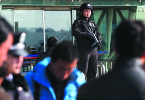 持槍特警在南京火車站候車室門口嚴密監控來往人流。