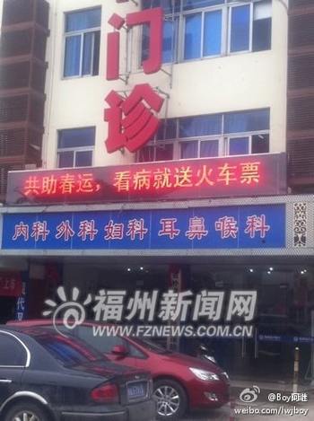 網(wǎng)友“Boy阿繼”供圖:“看病送火車票”(早上10許拍攝) 福州新聞網(wǎng)訊 8日10時(shí)許,網(wǎng)友“Boy阿繼”在微博上爆料:“看病送火車票,沒病都要去裝病啊!”該網(wǎng)友在這條微博下配了一幅圖,圖上一家門診下的LED屏幕上清楚地顯示著:“共助春運(yùn),看病就送火車票”。這一口號(hào)立即引發(fā)網(wǎng)友關(guān)注。 8日下午2時(shí)許,記者來到網(wǎng)友爆料的位于福州市倉山區(qū)的此醫(yī)院門口,果然看到醫(yī)院的LED屏幕上顯示著“共助春運(yùn),看病就送火車票”。記者在現(xiàn)場(chǎng)拍照,結(jié)果從醫(yī)院里闖出兩個(gè)人,強(qiáng)行奪走記者的相機(jī)并把所拍照片刪除。一名自稱是該門診機(jī)構(gòu)負(fù)責(zé)人的中年男士稱,他們只是在做促銷,門診方通過去火車站排隊(duì)、網(wǎng)絡(luò)預(yù)訂的方式為患者代買火車票。 記者看到一名為“陶陶-不淘”的網(wǎng)友也發(fā)微博稱:“剛才從那路口經(jīng)過,眼見為實(shí),拍下照片還有人上來兇巴巴的問我是干什么的!手機(jī)差點(diǎn)就被他們沒收咯。要我刪掉照片才放我走。” 下午3時(shí)許,記者再次來到這家醫(yī)院門口時(shí),其LED屏幕已經(jīng)不再顯示“看病就送火車票”的字樣。不過,記者從其醫(yī)院博客里仍看到:“凡在活動(dòng)期間,在醫(yī)院檢查、看病的外來務(wù)工人員,均可由院方代訂春節(jié)返鄉(xiāng)火車票。同時(shí),在院內(nèi)消費(fèi)數(shù)額達(dá)到2000元的患者,均可由院方贈(zèng)送一張返鄉(xiāng)火車票。”記者以看病為由咨詢前臺(tái)工作人員是否看病真的可以贈(zèng)送火車票這事,對(duì)方仍舊表示可以。 |
