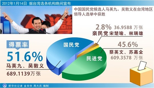 新華網臺北1月14日電 臺灣地區領導人選舉投票14日下午4時結束。開票結果顯示,中國國民黨候選人馬英九、吳敦義獲勝,得票6891139張,得票率為51.6%。