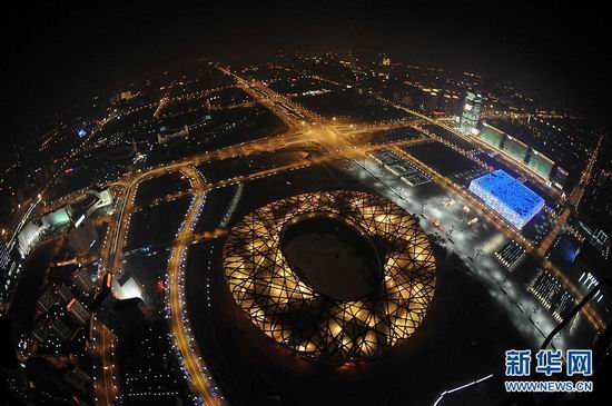 從空中俯瞰北京“鳥巢”夜景(1月22日攝)。當日是農歷除夕,北京市公安局出動7架次直升機服務安保工作,警用直升機承擔全市煙花爆竹燃放密集時段的空中實時監測和緊急處突任務,與地面形成立體化防控體系,確保市民在歡樂和諧的氛圍中度過除夕。(新華社記者 楊光 攝)
