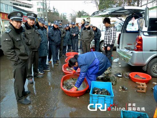 2012年1月29日,南京鎖金村一處路口,十多位身著制服的城管隊(duì)員肅立圍觀占道經(jīng)營的魚攤,不一會(huì),攤主便抵擋不住,匆忙撤攤。據(jù)了解,當(dāng)天是春節(jié)后上班首日,節(jié)日中占道經(jīng)營的商販們已回到開門營業(yè)的農(nóng)貿(mào)市場里,但有少數(shù)攤販仍滯留在路邊做生意,在城管執(zhí)法時(shí)軟磨硬扛,城管隊(duì)員便采取圍觀執(zhí)法的方式,盯走攤販。