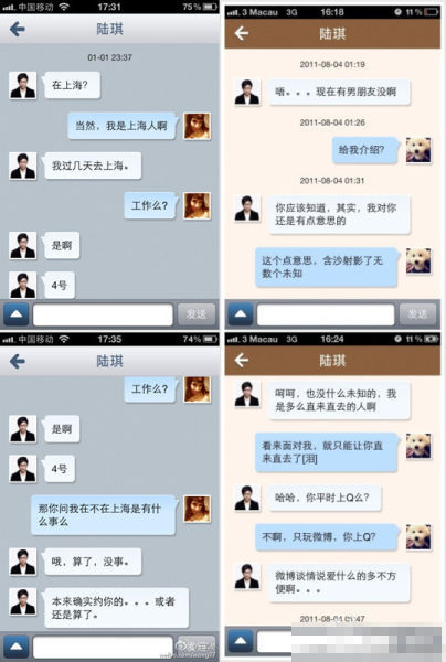 模特曹思陽隨后也更新了一條微博,并放出了私信的截屏。從圖片內容上來看,疑似陸琪挑逗曹思陽的內容。在詢問對方是否有男友后,陸琪表示:“你應該知道,其實,我對你是有點意思的。” 模特王真熒也發了一條附有私信截屏的微博,并表示:“是時候把你陸琪拉出來曬曬太陽了”從私信截屏上看,內容大意疑似陸琪想去上海時約對方。