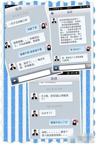 主持人李解則發了一條附有私信截屏的微博,私信中有“抱你一下乖乖睡覺”,“好吧,要多個男人的話就找我唄”等內容。此外,李解還表示:“我也來湊個熱鬧。其實早就想發出來讓那些迷得不行的小丫頭們看看陸琪。想做情種就別想出名,有點名氣就小心做人。一不留神,翻了船,值得嗎?”