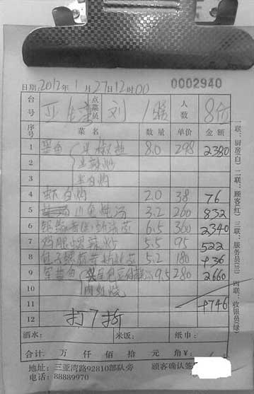 記者看到,這個菜單的就餐日期是2012年1月27日,“臺號”是亞龍灣,就餐人數是8位??偣颤c了7道海鮮:墨魚點了8斤(分椒鹽、辣炒和白灼),單價298元,共2380元;白灼蝦2斤,共76元;山龜燉湯3.2斤,共832元;一份6.5斤的清蒸鋸緣青(蘭)蚧,2340元;辣炒雞腿螺5.5斤,936元;以及9.5斤的軍曹魚,2660元,共計9746元。