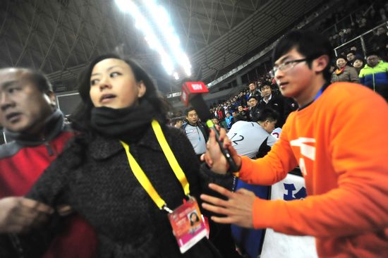 女記者被指粗暴對(duì)待志愿者 青島新聞網(wǎng)2月7日訊 2月5日晚,CBA聯(lián)賽戰(zhàn)罷倒數(shù)第四輪,青島男籃主場(chǎng)擊敗已經(jīng)躋身季后賽的勁旅北京隊(duì)。一個(gè)隨隊(duì)的北京女記者因?qū)Σ门械呐辛P不滿(mǎn)闖進(jìn)球場(chǎng),隨后引發(fā)一連串沖突,事件最終以鬧劇收?qǐng)觥1荣惤Y(jié)束兩天了,但“女記者球場(chǎng)耍潑”事件卻成了微博的熱議話(huà)題。 讓我們把時(shí)間撥回到2月5日晚的比賽現(xiàn)場(chǎng)。由于馬布里有傷,也可能是已經(jīng)躋身季后賽讓球員有些放松,北京隊(duì)上半場(chǎng)完全處于落后的境地。第三節(jié)開(kāi)始北京隊(duì)發(fā)起了反擊,但進(jìn)攻稍有起勢(shì)球員就接連犯規(guī)和違例。北京隊(duì)外援莫里斯和青島外援奧德杰的一個(gè)身體接觸,裁判判罰莫里斯犯規(guī),此舉引發(fā)北京隊(duì)的強(qiáng)烈不滿(mǎn),主教練閔鹿蕾上前與裁判理論又吃到技術(shù)犯規(guī)。 到這時(shí)比賽雖然激烈但仍在可控范圍內(nèi),接下來(lái)的一幕卻出乎很多人意料:一名北京的隨隊(duì)女記者在暫停階段直接進(jìn)入場(chǎng)內(nèi)和裁判對(duì)話(huà)。事后據(jù)坐在她旁邊的一位青島記者回憶,這位女記者回來(lái)后和他同事說(shuō)了一番耐人尋味的話(huà),“我和他說(shuō)要給他做個(gè)裁判專(zhuān)題,北京隊(duì)剛起勢(shì)就讓他給吹下去了。” |