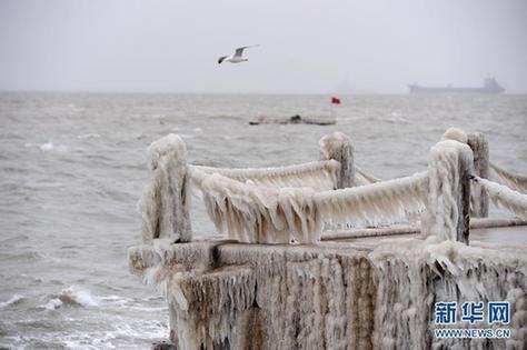 2月7日,山東煙臺東炮臺旅游碼頭的防護欄上結滿海水冰凌。新華社發(初陽 攝)