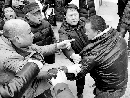 事發(fā)現(xiàn)場,張妙丈夫王輝(右)與藥慶衛(wèi)代理律師馬延明(左)不時(shí)互有推搡。《三秦都市報(bào)》供圖