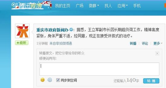 新華網北京電 8日上午10點54分,重慶市政府新聞辦通過新華網官方微博發布消息,稱“據悉,王立軍副市長因長期超負荷工作,精神高度緊張,身體嚴重不適,經同意,現正在接受休假式的治療。”
