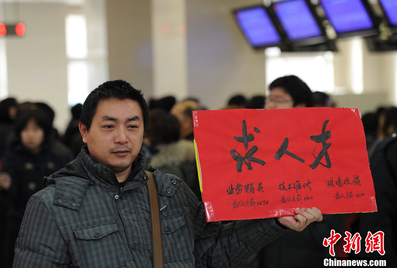 龍年新春伊始,在珠三角、長三角的工業(yè)園區(qū)、勞務市場等地,招聘廣告隨處可見,“急需大量普工”“技術(shù)工人大招聘,待遇從優(yōu)”等廣告詞表達著企業(yè)“求工若渴”的迫切心情,很多企業(yè)甚至將招工陣地前移,到火車站、汽車站、勞務介紹所等一線“搶人”,但目前節(jié)后用工市場情況不容樂觀。圖為2月7日,西安招聘會現(xiàn)場,一位男子手拿紙板制作的招聘板在場內(nèi)轉(zhuǎn)悠,不時有人上前詢問。趙雄韜攝