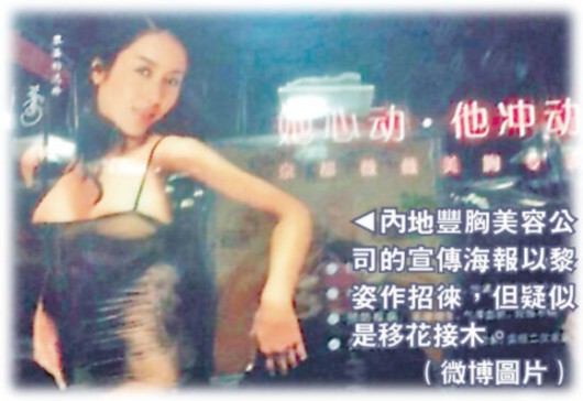 豐胸美容公司的宣傳海報(bào)以黎姿作招徠,但疑似是移花接木。 據(jù)香港媒體報(bào)道,40歲的黎姿于2008年宣布退出娛樂圈后,下嫁商人馬廷強(qiáng),生了一對(duì)雙胞胎女兒,以及專心打理弟弟的美容生意。雖然她已退出娛樂圈3年多了,但她的一舉一動(dòng)仍極受關(guān)注。近日發(fā)現(xiàn)有內(nèi)地美容公司聲稱她是代言人,還在豐胸宣傳海報(bào)上把黎姿的相套在性感低胸女郎身上作招徠。黎姿立刻在微博澄清,她從來沒有為該間公司做代言人,還怒斥離譜,以正視聽。 昨天(2月11日)下午有內(nèi)地粉絲在微博上載一張豐胸美容公司的宣傳海報(bào),相片中的性感女郎穿著黑色低胸吊帶裙,上圍極為豐滿,而樣貌就跟黎姿一模一樣。不過,女郎的身材與黎姿樣貌配合得非常不自然的,就像移花接木。翻查該美容公司的官方網(wǎng)頁,網(wǎng)頁內(nèi)也聲稱黎姿是代言人。 不止一次被利用宣傳 黎姿看見粉絲上載的照片后,她立刻留言澄清。她說:“從來沒拍過這照片,移花接木,太離譜了,這公司不是我代言的。”原來黎姿早已知道該公司不止一次利用她來宣傳,她說:“這公司已經(jīng)接二連三做出這事情了,TVB從沒幫我簽有關(guān)豐胸廣告呀。” 粉絲建議控侵肖像權(quán) 不少粉絲留言表示,曾誤信黎姿真的是該公司代言人,因在內(nèi)地很多地方都見到她在該公司的宣傳海報(bào),建議她應(yīng)采取法律行動(dòng),控告該公司侵犯其肖像權(quán)。 |