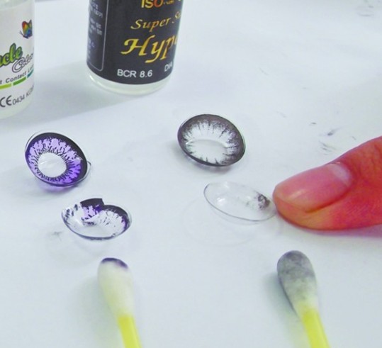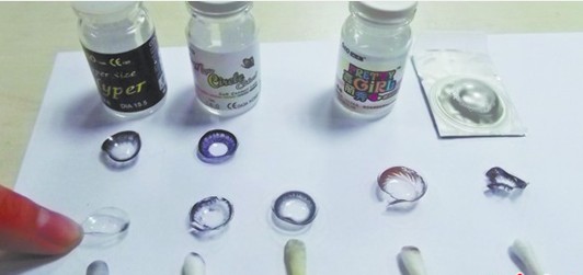 ![]() 被擦破了依然沒掉色;GEO(左二)掉色比護理 片則幾乎被擦拭成透明的。 浸泡十分鐘后用棉花棒擦拭大美目鏡片后,發現顏色能輕易被擦拭掉。 酒精浸泡對比:大美目(左一)被擦成透明;GEO(左二)被擦掉一半;昕視(左三)稍稍出現掉色;嘉麗秀(右二)只是掉了一點顏色;強生(右一)擦破也沒掉色。 記者借助酒精搞實驗 讓劣質美瞳現原形 為了驗證市面上各種美瞳的質量,記者買來五種美瞳做實驗,一種是在臺東夜市購買的售價40元的黑色大美目隱形眼鏡,第二種是在臺東小店購買的GEO 蜜糖紫色隱形眼鏡,價格60元,第三種是在臺東某眼鏡超市購買的年拋黑色彩片,價格78元,第四種是在大光明眼鏡店購買的半年拋棕色嘉麗秀美瞳,價格 80元,最后一種是在正規眼鏡店購買的強生日拋美瞳,五片價格49元。 首先,記者將買來的五種品牌的美瞳分別放到倒滿護理液的隱形眼鏡盒中,浸泡10分鐘。 10分鐘后,記者用干凈的棉棒反復擦拭“大美目”黑色圖案的鏡片內部,原本清晰的圖案開始發生變化,兩分鐘內,變成了一片透明的鏡片,棉棒一端也變得很臟。 記者又取出名為“GEO”的紫色美瞳鏡片擦拭,擦拭了幾次后,棉棒上出現了泛紅的顏色,鏡片上的圖案也被擦拭得不完整。兩分鐘后,鏡片上美麗的圖案被擦拭得參差不齊。 記者將同樣浸泡10分鐘的強生美瞳、黑色彩片以及嘉麗秀棕色美瞳放在同一張白紙上進行擦拭,但是反復擦拭多次后發現,棉棒上均沒有沾染顏色。最后強生鏡片被擦拭殘破,也沒有出現掉色的現象。 隨后,記者將五種鏡片重新放回護理液中,待鏡片基本展開并恢復原形后拿出,泡入酒精中。一接觸酒精,鏡片立即收縮卷了起來,隨后鏡片盡管又慢慢恢復原形,但是邊緣開始變皺。 浸泡十秒鐘后,記者用棉棒再次擦拭“大美目”和“GEO”美瞳鏡片內部,這次擦掉鏡片上的顏色就更容易了,不一會,“大美目”鏡片就被擦拭成了完全透明的鏡片,而“GEO ”鏡片上的圖案也被擦拭得更加斑駁,紫色部分已經全部消失,只留下一圈黑色。而且經過酒精浸泡的鏡片變得十分脆弱,擦拭幾下后鏡片便破裂了。 蘸過酒精的黑色彩片和嘉麗秀均有掉色現象,但是并不嚴重。用酒精浸泡過的強生美瞳,在擦拭中盡管被擦破成碎片,但仍未出現掉色現象。 實驗結果表明 ,記者在小店內購買的兩種低價美瞳,用普通的眼鏡護理液和酒精浸泡擦拭后都出現掉色現象,而從正規眼鏡店購買的強生品牌美瞳盡管同樣被護理液和酒精浸泡過,但沒有出現掉色現象。 |