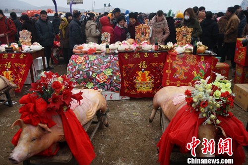 3月18日上午,在山東省即墨市田橫鎮周戈莊,漁民們一大早就把生豬、公雞、鱸魚擺在海邊上,焚紙燒香,燃放鞭炮,鑼鼓齊奏,金龍狂舞,將一年一度的祭海盛會推向高潮。(中新社發徐崇德 攝)