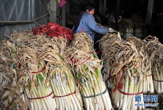 3月16日,山東省章丘市明家村的農民將準備供應市場的大蔥整理成捆。近期以來,受種植面積減少和不利氣候因素等影響,市場上的大蔥供應不足,價格持續走高,一些地區每斤大蔥的價格超過了5元錢。作為我國大蔥主產區之一的山東省目前尚有一定數量的越冬大蔥保存在蔥田里。3月中旬以來,氣溫明顯上升,山東各地蔥農利用氣溫回暖、土壤解凍的有利條件開始大量收獲越冬大蔥,供應市場。