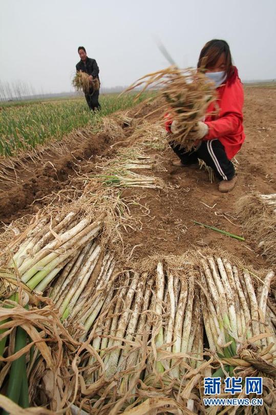 3月9日,山東省臨沂市郯城縣郯城街道辦事處新埠村農(nóng)民在收獲大蔥。據(jù)新華社全國(guó)農(nóng)副產(chǎn)品和農(nóng)資價(jià)格行情系統(tǒng)監(jiān)測(cè),2月中旬以來(lái),大蔥價(jià)格由降轉(zhuǎn)漲,且漲速較快。與2月10日相比,3月7日,全國(guó)大蔥價(jià)格上漲15.5%。目前,全國(guó)大蔥價(jià)格大幅高于2011年同期,3月7日價(jià)格同比上漲53.1%。新華社發(fā)(張春雷攝) |