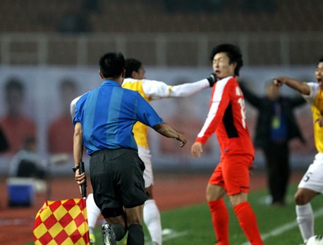 在此期間,央視的轉(zhuǎn)播鏡頭直接轉(zhuǎn)向了青島球迷,而頗具意味的是,青島球迷在賽前布置的助威條幅出現(xiàn)在畫(huà)面上,“鄭龍生日快樂(lè)”。經(jīng)過(guò)了4分鐘的暫停之后,比賽恢復(fù)。主裁判向鄭龍出示了紅牌,被罰下場(chǎng)。然而當(dāng)比賽再次恢復(fù)的時(shí)候,全場(chǎng)球迷又一次喊出了“申鑫傻X”“傻X申鑫”的漫罵語(yǔ)。
