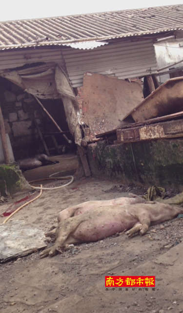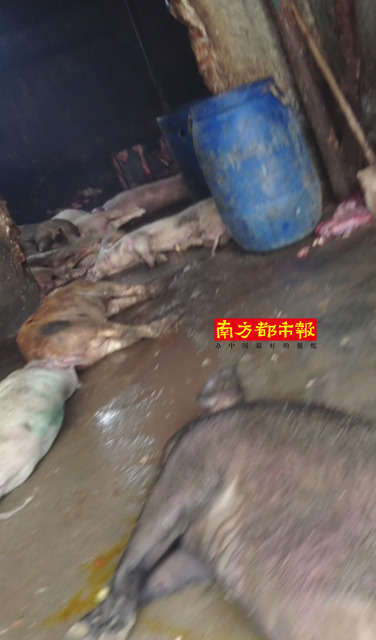 死豬屠宰場堆放著二三十頭死豬,幾頭豬還有一點點氣息,現場散發出惡臭