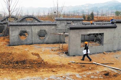 中華園內,4面高3.9米的墻壁格外引人注目,目前施工已經接近尾聲,這些墻透露著濃郁的蘇州園林風格。施工人員告訴記者,墻壁自西向東分別叫做點墨墻、瀲滟墻、依綠墻、飛練墻,它們構成了一個江南風格建筑組合。每面墻壁的窗、門各有特色,四面墻由甬道相連,中間種植銀杏等樹木。