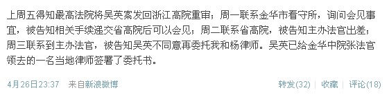 ????4月26日晚間,吳英辯護律師張雁峰在微博上表示,本周三(4月25日)他被告知吳英不同意再委托其和楊照東律師,轉(zhuǎn)而與成浙江金華本地的一名律師簽署委托書。