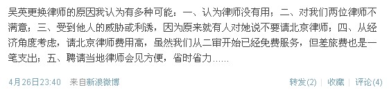 ????4月26日23點37分,吳英辯護律師表示在幾次聯(lián)系會見吳英未果后,被吳英案主辦法官告知吳英已更換律師。隨后,張雁峰又發(fā)布微博分析了其中的原因,他表示從二審起就免費為吳英提供辯護,更換律師的原因或是受到他人的威脅或利誘。其博文截圖如下: