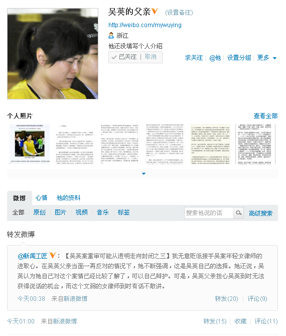 ????微博認(rèn)證為媒體人萬茵的用戶發(fā)布三條微博,稱吳英案重審可能從透明走向封閉。他還在微博中指出,該律師取得律師資格時間不長,沒有刑辯經(jīng)驗。并且其發(fā)現(xiàn)這名律師分不清吳英案中的檢舉行為是自首還是立功。面對吳英父親的反對,該律師不斷強調(diào),這是吳英自己的選擇。她還說,吳英認(rèn)為她自己對這個案情已經(jīng)比較了解了,可以自己辯護。但“吳英父親擔(dān)心吳英到時無法獲得說話的機會,而這個文弱的女律師到時有話不敢講”。微博分析稱,法院反干預(yù)的首要措施就是控制信息公開,安排一個可控的律師至關(guān)重要。截止記者發(fā)稿時,認(rèn)證用戶名為楊照東的微博并未就此事表態(tài)。