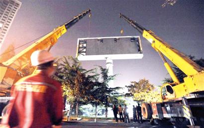 昨天深夜11時,青島市城管執法局指揮兩輛26噸重型吊車,開始拆除五四廣場綠地內一個高27米、總重67噸的高炮廣告牌。據介紹,這個造價1000多萬元的高炮廣告牌是國內唯一一個能360度旋轉的單立柱高炮廣告牌。 據介紹,這個高炮廣告牌位于五四廣場綠地西側。根據我市戶外廣告相關條例,市內四區禁止設置單立柱廣告,該廣告牌已經不符合新規要求,到期予以拆除。據介紹,該廣告牌高27米,柱體重約27噸,LED顯示屏重40噸。城管部門調集兩輛重型吊車對其實施拆除。預計拆除施工將持續到3日凌晨4時左右。(記者 趙健鵬 通訊員 張君 攝) |
