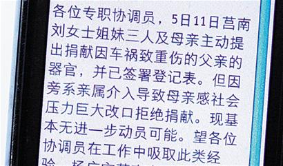 “雖然多方努力,但對方最終還是不同意捐獻。現基本無進一步動員可能……”昨天上午10點,市紅十字會負責器官捐獻移植工作的張少琴收到了這樣一條短信,使我市首次器官捐獻移植手術出現變故。從前天上午一直到昨天,張少琴和醫院的專家們都在緊張地為手術準備著。沒想到主動提出器官捐獻的家屬迫于旁系親屬阻撓的壓力最終反悔。兩名受捐者也只能繼續苦苦地等待下去…… □記者 田璐 緣起: 車禍家屬提出捐獻器官 “我是前天中午12點左右接到了省紅十字會電話,告訴我們在莒南有一起車禍的家屬提出要捐獻病危患者器官,安排青島器官捐獻試點醫院前去接受器官。 ”張少琴告訴記者,雖然目前山東省已經有了6例器官捐獻移植了,但自從去年青島的青醫附院、401醫院和市立醫院成為首批器官移植試點醫院之后,這還是第一次接受器官捐獻任務。這就意味著青島的器官壞死患者可以獲得捐獻救助了。 接到電話之后,張少琴立刻與莒南方面取得聯系了解捐獻者信息。捐獻者是莒南一名50多歲的男士,因為車禍受傷嚴重,醫院雖然全力搶救但是幾乎沒有生還可能了。在這樣的情況下,他的妻子和3個女兒主動跟醫院提出捐獻器官。醫院第一時間和山東省紅十字會取到了聯系。張少琴說:“我們聯系的時候,捐獻者還是處于腦死亡的狀態,在呼吸機等儀器的幫助下,肝臟等器官還在運轉。從醫學角度上來說,器官捐獻移植成功的幾率非常大。 ” 準備1: 緊急啟動器官移植平臺 記者了解到,這一次之所以選擇了青島的試點醫院接受器官,也是考慮到莒南和青島距離相對較近,運輸時間短,不會超過器官存放的時間。 “器官移植成功有兩個時間條件。 ”專家介紹,心臟停止跳動之后8分鐘之內必須成功切除器官,這樣才能保證器官可以移植。而切除之后要存放在特殊的器皿中運輸到等著移植的醫療機構。這個過程不要超過10個小時。超過這個時間,器官就沒有使用的價值了,移植也就沒有必要實施了。 時間就是生命!在確認對方捐獻器官并簽訂了器官捐獻登記表之后,青島和莒南方面立刻架起了器官捐獻移植的平臺。莒南方面負責對捐獻者的身體進行一系列檢查。這包括血型、肝臟功能等檢查,最重要的一點就是確診他的肝腎等器官是否符合移植條件。而青島紅十字會也是第一時間將這一消息通知給青醫附院和401醫院這兩家山東省首批器官移植試點醫院的工作人員。一方面是將患者相關資料傳遞給這兩家醫院,便于他們在短時間內找到合適的受捐患者,另一方面通知相關專家做好隨時動身去莒南接受器官的準備。 準備2: 選出兩名肝腎衰竭患者 “接到紅十字會的電話之后,我們立刻開始為去莒南接受器官做準備,并根據對方提供的信息開始篩選合適的受捐者。”解放軍第401醫院肝膽外科主任袁偉升告訴記者,器官移植業內有一個全國性的統計,每150個需要進行器官移植的病人里面,只有1個可以得到器官并移植成功。由于等待器官移植的患者太多,他們需要按照前后順序以及急危險重的病情情況來選出接受器官捐獻的患者。最終,他們從眾多的等待者中選出了一個血型和捐獻者一樣,而且急需器官移植的肝功能衰竭患者。這位患者是一名40多歲的男市民。 與此同時,青醫附院人體器官移植管理辦公室主任張斌也在積極地準備著。他需要選出一個需要腎移植的患者,最終選擇出了一個腎功能衰竭的患者。但是這一切都是悄悄地進行著,沒有通知患者。 “一方面是規定不允許,另一方面是告訴了對方,會提前造成心理壓力。 ”張斌對記者說。選出受捐者之后,醫院的專家們就開始焦急地等待著捐獻者最后的檢查結果。前天下午1點多,對方的檢查結果出來,肝腎功能符合移植條件。接到這一消息之后,醫院立刻啟動器官移植手術準備,并通知了患者家屬。 波折:捐獻家屬突然“叫停” 兩家醫院接受器官的車輛隨時動身,受捐者也開始接受手術前的準備了……一切都在朝著好的方向發展。沒想到,下午2時,正當紅十字會工作人員和島城醫院的專家準備動身的時候,卻接到了令人震驚的消息。山東省紅十字會工作人員打來電話說,原本主動提出要捐獻的家屬突然提出來再考慮一下,青島方面暫時不要動身。 “接到這個電話,我都吃驚了。對方都已經在捐獻登記表上簽字了,難不能中間又出了什么插曲?說實話,我的心當時就一沉。 ”張少琴告訴記者,她立刻與莒南方面聯系了解到,雖然捐獻者的妻子和女兒都同意捐獻,但是他的一些親戚卻極力阻撓,這讓捐獻者的妻子和女兒壓力很大,提出了再考慮一下。可是時間不等人呀,一旦捐獻者突然死亡而青島的專家又趕不到現場那就錯過了移植機會。在這樣的情況下,山東省紅會立刻安排相關負責人趕赴莒南進行協調,爭取捐獻能順利進行。 結果:親戚阻擋讓捐獻“變卦” 此時,青島方面的專家們也是如坐針氈,焦急地等待著。受捐者的家屬一遍遍地向醫院訊問著何時能夠接受手術,因為對于他們來說,如果錯過了這次機會,他們的親人就有可能在等待中死去。但是青島方面每一次聯系省紅十字會工作人員,都是得到了暫時等待的答復。 “捐獻者的妻子和三個女兒都同意捐獻,可是他的親戚們極力反對,說捐獻了人就沒有全尸了。 ”張少琴告訴記者,捐獻者的親屬在醫院百般阻撓,有人甚至還責罵他的女兒,說他們對不起父親。“