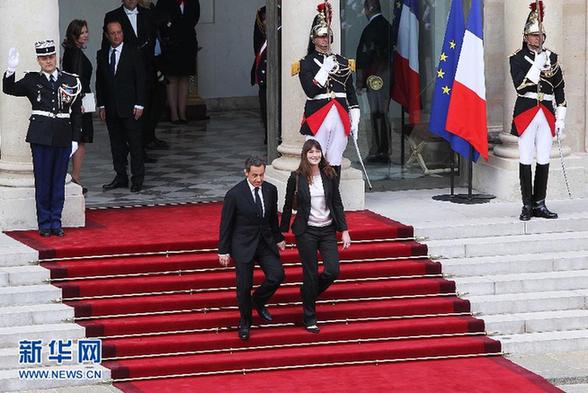 5月15日,在法國巴黎總統府愛麗舍宮,離任的法國總統尼古拉·薩科齊(前左)與夫人卡拉·布呂尼(前右)在當選總統奧朗德(左三)及女友瓦萊麗(左二)的注視下離開愛麗舍宮。當日,法國總統權力交接儀式在愛麗舍宮舉行,薩科齊向奧朗德正式移交總統權力。