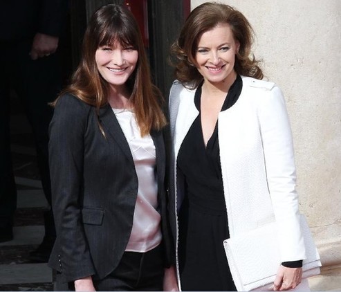 ????5月15日,在法國巴黎總統府愛麗舍宮,即將離任的法國總統尼古拉·薩科齊的夫人卡拉·布呂尼(左)在總統權力交接儀式前迎接當選總統弗朗索瓦·奧朗德的女友瓦萊麗·特里埃維勒。當日,法國總統權力交接儀式在愛麗舍宮舉行,薩科齊向奧朗德正式移交總統權力。
