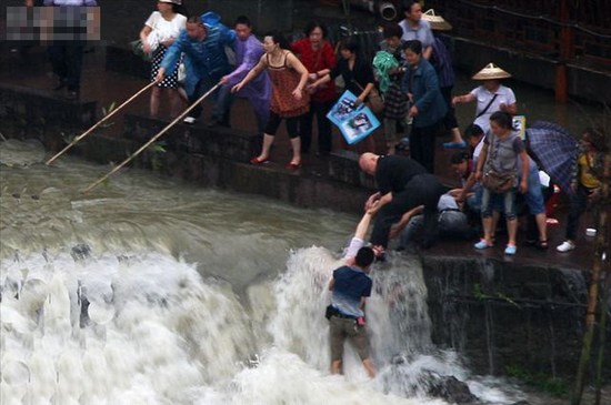 在岸上群眾幫助下,兩名施救者將老人救上岸。而第一位下水救人的游客卻被沖離岸邊,岸上的群眾紛紛用竹竿去拉他。