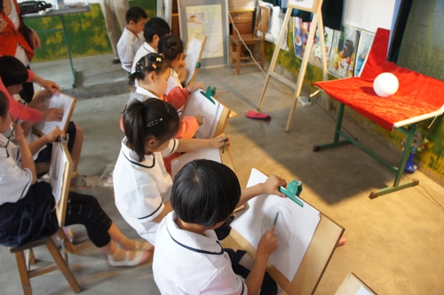 張家樓鎮(zhèn)中心小學(xué)的綠澤小畫社正在進(jìn)行寫生活動(dòng)