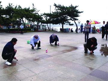 為了給棧橋除“雀斑”,從5月末開始,動用一輛高壓水車,30名年齡均在45歲左右的棧橋管理和保潔人員開始了一場清除口香糖的“攻堅戰(zhàn)”。管理員王立新告訴記者,當時一共購買了80桶重1斤的洗衣液,200多個刷鍋用的小鐵刷和10公斤火堿,還給每個人配上了皮手套,每天早上7點就開始動工,一直要忙到下午5點。 “先要拿著水槍使勁沖,但很多附著在地上的口香糖都需要一點點拿鏟子鏟,實在不行就得用上火堿。 ”王立新笑著說,趁著廣場上還沒安上攔車柱,水車也沿著西東廣場一直開到了回瀾閣上。“現(xiàn)在走在路上還是能看到清理后留下的黑斑,但是沒以前明顯了。 ”王立新告訴記者,每逢周末便會超過10萬人,進入7月旅游高峰期后,預計游客量將會激增至13萬人,景區(qū)內(nèi)并沒設(shè)立提示牌,還需要游客能自覺文明游覽。