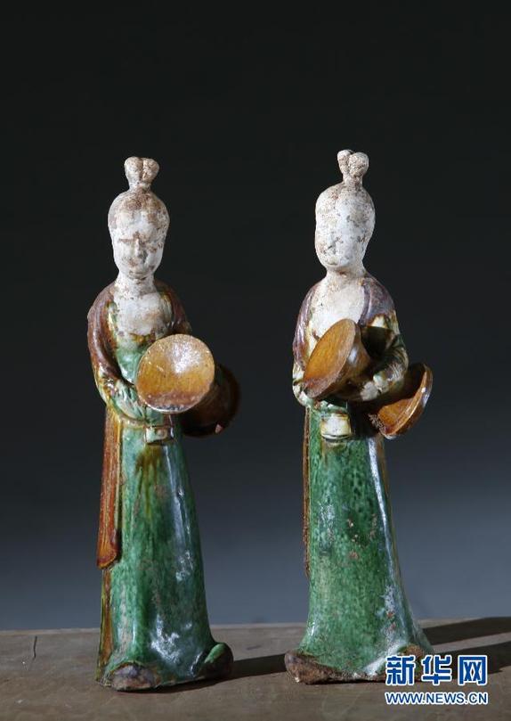 這是河南洛陽唐代墓中發掘出的一對手持鼓的三彩樂舞俑(2012年6月4日攝)。