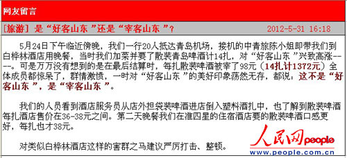????6月3日,人民網(wǎng)地方領(lǐng)導(dǎo)留言板上有這樣一條留言:“5月24日下午臨近傍晚,我們一行20人從福建抵達(dá)青島機(jī)場(chǎng),接機(jī)的中青旅陳小姐即帶我們到白樺林酒店用晚餐,當(dāng)時(shí)我們加菜并要了散裝青島啤酒計(jì)14扎,對(duì)‘好客山東’興致高漲。可是萬(wàn)萬(wàn)沒(méi)有想到的是在最后結(jié)算時(shí),每扎散裝啤酒被宰了98元(14扎計(jì)1372元)全體成員都驚呆了,群情激憤,一時(shí)對(duì)‘好客山東’的美好印象蕩然無(wú)存,都說(shuō):