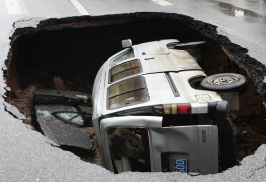 道路塌陷似2米深大酒缸 整個面包車翻入(圖)