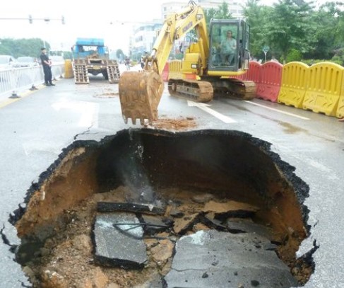 西安路面發生嚴重塌陷 形成15米長6米深巨坑(組圖)