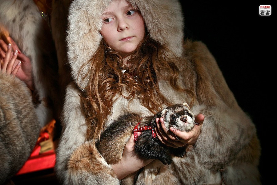 9歲的蘇菲抱著她的寵物參加“百萬富翁展銷會”上的T臺時裝秀。這場秀是由她的母親,一位著名的毛皮服裝設計師舉辦的。