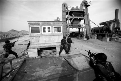 戰士圍攻“敵對武裝分子”。昨晚,酒泉衛星發射基地,軍方進行了演習,假想對象為持有重火力的武裝分子,目標是保衛神九正常發射。