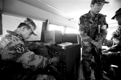 裝甲車里一名戰士正在操作著檢測系統。他說,這套軍用的監控系統不但可隨時與總部進行語音聯絡,還能將攝錄下來的視頻資料傳給上級。