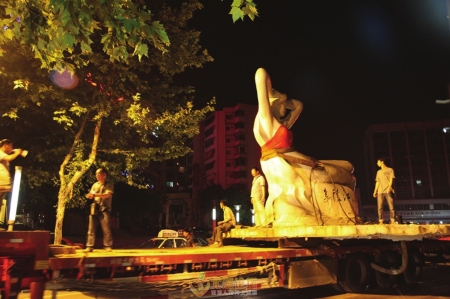 昨日凌晨零時43分,一輛200噸的大型吊車將合重57噸,總高為6.5米的女神雕塑成功吊起,輕放在一輛大型平板拖掛車上,拖車以每小時小于5公里的時速,慢慢起步,開往嘉陵江邊濱江大道。難舍的市民一路跟著,步行送別。