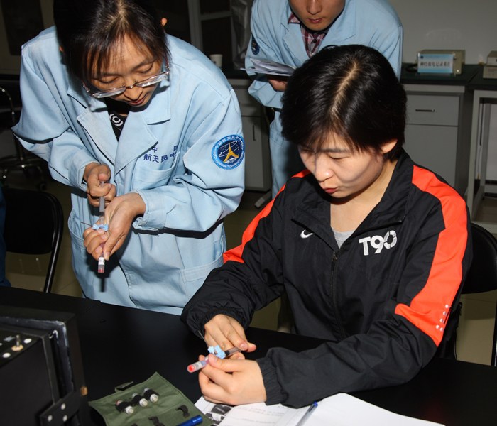 航天員教員對航天員劉洋進行離心管中加尿樣操作訓練。新華社發(秦憲安攝)