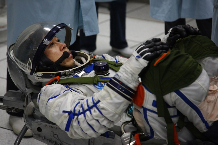 工作人員在對航天員劉旺的航天飛行服進行氣密性檢查。新華社發(秦憲安攝)