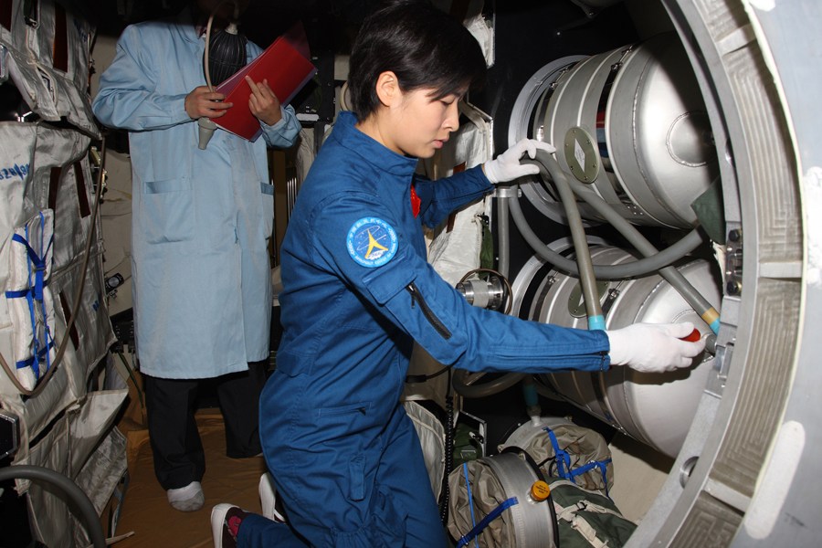 航天員劉洋在模擬天宮一號組合體內檢查實驗設備。新華社發(秦憲安攝)