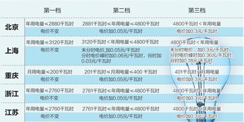 上海居民階梯電價水平分檔遞增,同時繼續推行分時電價:第一檔電量電價不作調整,且3年之內保持基本穩定。第二檔電量未分時電價加價標準為每度電0.05元;分時電價峰時段每度電加0.06元,谷時段每度電加0.03元。第三檔電量電價,未分時電價加價標準為每度電0.30元;分時電價峰時段每度電加0.36元,谷時段每度電加0.18元。上海居民階梯電價還適當考慮了一戶多人口家庭的情況。而城鄉“低保戶”和農村“五保戶”家庭,每戶每月可免費使用15度電。