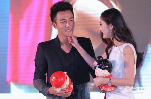 現(xiàn)場(chǎng),楊冪和劉愷威大秀恩愛(ài),楊冪摸劉愷威下巴假裝“調(diào)戲”,劉愷威頻頻輕撫楊冪秀發(fā)。在媒體大聲起哄“親一個(gè),親一個(gè)”之后,楊冪則用手上的娃娃擋住臉,倚靠在劉愷威肩上,嬌羞裝嗲,盡顯小女人味道。