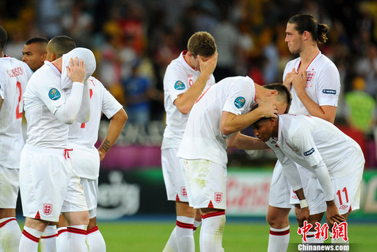 當地時間24日晚,2012年歐洲杯進行了最后一場四分之一決賽。最終,意大利隊(藍衣)在點球大戰中4比2戰勝英格蘭隊,鎖定最后一個四強席位。圖為失落的英格蘭隊隊員。