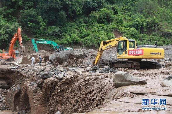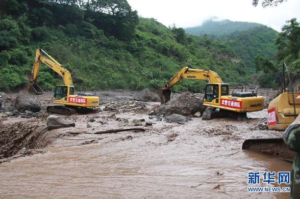 6月28日,搶險人員在四川涼山州寧南縣用機械搶通被沖毀的道路。
