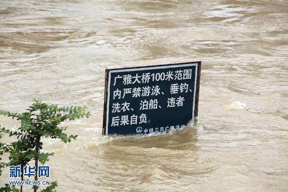 6月28日,廣西柳州柳江邊道路上的警示牌被淹。