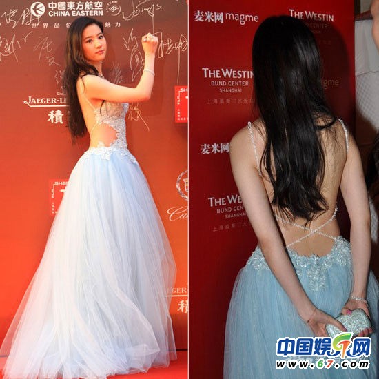 劉亦菲淺藍水晶蕾絲紗難掩清純氣息,露背裝性感大突破不失玉女風范。